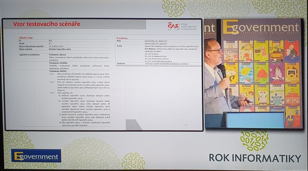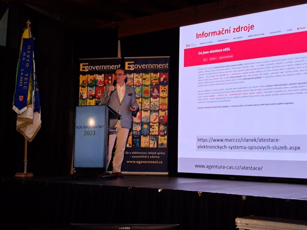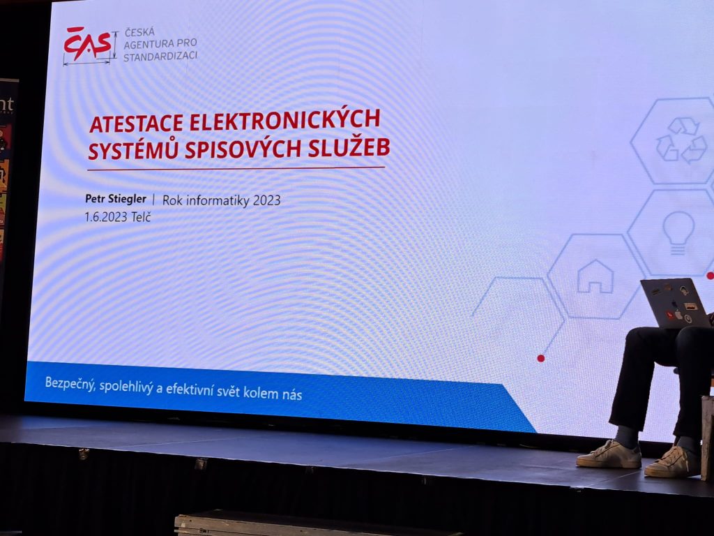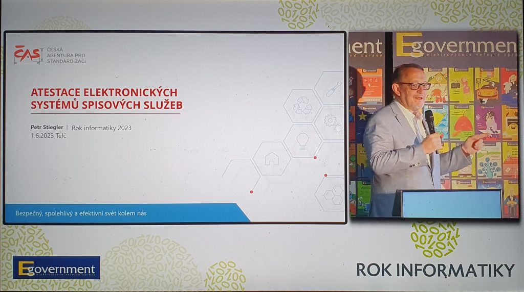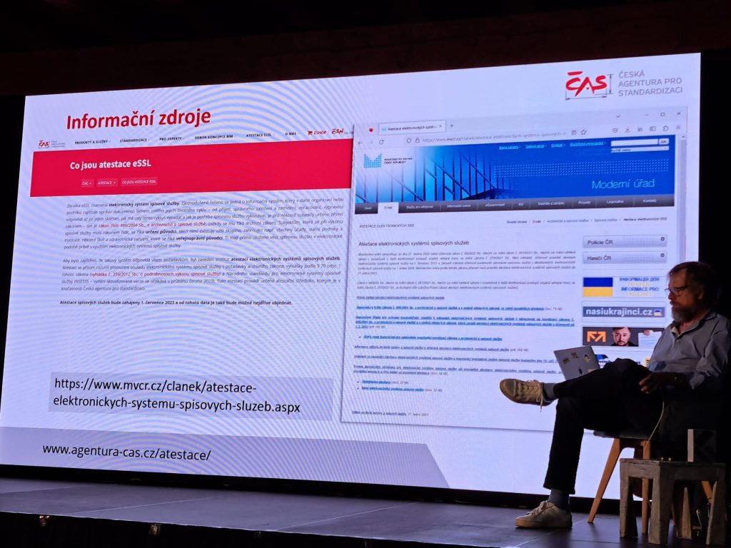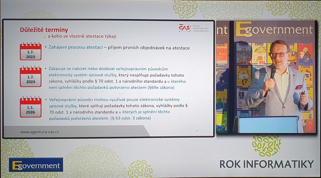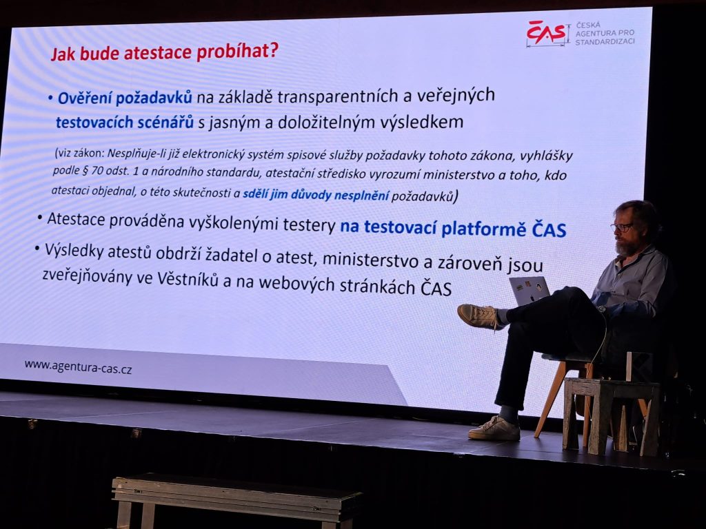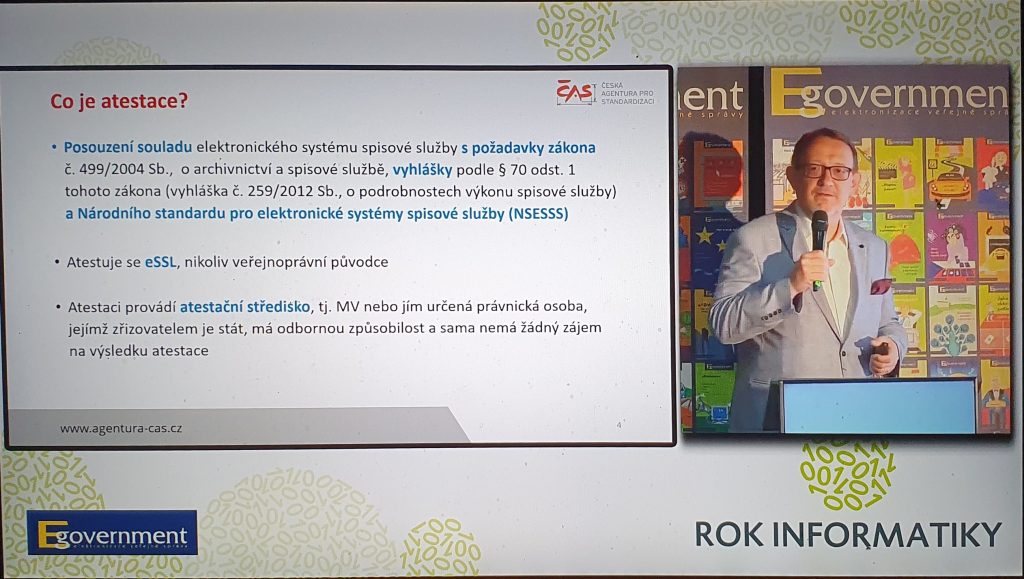Petr Stiegler z České agentury pro standardizaci přišel na pódium hned vzápětí a prohlásil, že atestace spisových služeb se budou týkat vlastně úplně všech. Měl tím samozřejmě na mysli tak zvané veřejnoprávní původce. To jsou veřejné instituce definované archivním zákonem. „Jde především o úřady, ale zdaleka nejen o ně,“ připomněl Stiegler s tím, že do této definice spadají také například státní podniky, školy (s výjimkou mateřských) a celá řada dalších subjektů. Všechny tyto organizace budou muset nejpozději od 1. ledna 2026 vést spisovou službu elektronicky a používat jen atestovaný elektronický systém spisové služby (eSSL).