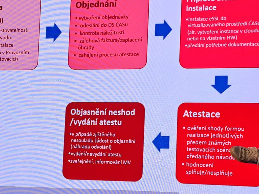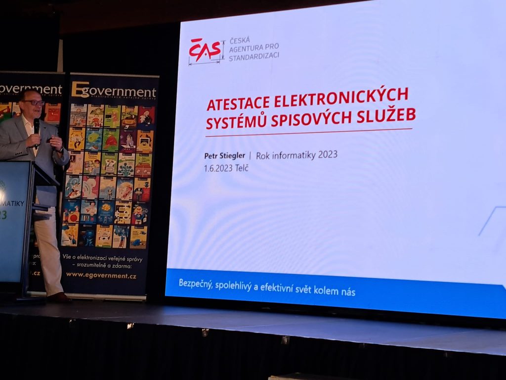 Atestačním místem je podle rozhodnutí Ministerstva vnitra Česká agentura pro standardizaci. Jak Petr Stiegler zdůraznil, objednávat atestace je možné od 1. července 2023. Atestaci bude objednávat ve většině případů dodavatel eSSL. Pokud by totiž atest jejich produkt neměl, nemohou ho nabízet veřejnoprávním původcům. „A tím by si výrazně omezili okruh svým zákazníků,“ uvedl Stiegler a dodal: „Mohou ale nastat případy, kdy si bude muset atest zajistit sám veřejnoprávní původce. Jde zejména o situace, když už dodavatel neexistuje nebo nemá zájem atest zajistit.“ Jak poté Petr Stiegler připomněl, může jít také o případy, kdy je elektronický systém spisové služby složen z modulů od různých dodavatelů nebo naopak je integrován do většího informačního systému.