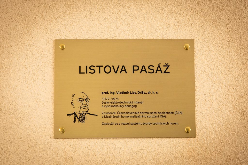 Praha, 7. června 2023 – Předseda Úřadu pro technickou normalizaci, metrologii a státní zkušebnictví (ÚNMZ) Viktor Pokorný a generální ředitel České agentury pro standardizaci (ČAS) Zdeněk Veselý slavnostně otevřeli Listovu pasáž. Původní těšnovská pasáž dostala jméno po profesoru Vladimíru Listovi. Významný český elektrotechnický inženýr a vysokoškolský pedagog tak konečně získá důstojné připomenutí svého přínosu českému průmyslu. Není přitom náhodou, že Listova pasáž se nachází v blízkosti sídla ÚNMZ a Agentury ČAS. Byl to totiž právě Vladimír List, kdo se významně zasloužil o vznik systému Československých technických norem i o to, že již od dvacátých let minulého století hrálo Československo významnou roli v mezinárodních normalizačních institucích.