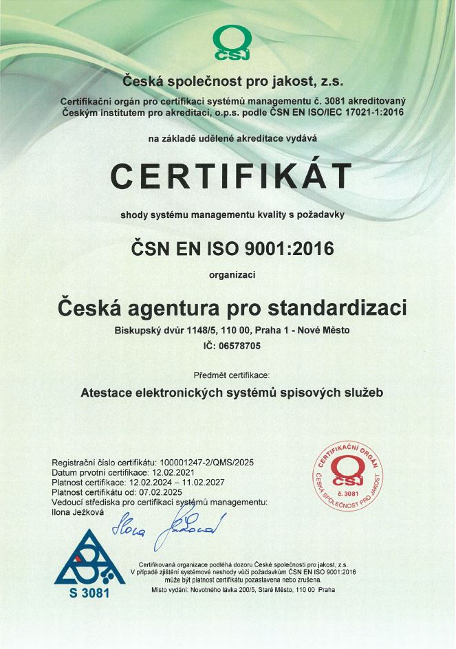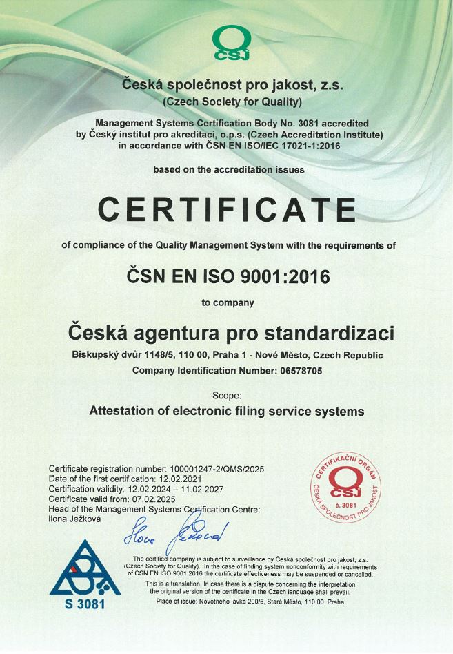 S radostí oznamujeme, že jsme úspěšně absolvovali audit systému managementu kvality podle normy ČSN EN ISO 9001:2016 a obhájili shodu procesů Atestačního střediska pro eSSL s tímto mezinárodním standardem. Rozšířený rozsah certifikace potvrzuje náš závazek ke kvalitě, efektivitě a neustálému zlepšování. Certifikát, vydaný akreditovaným certifikačním orgánem – Českou společností pro jakost, potvrzuje správnost našeho směřování a je pro nás zároveň motivací k dalšímu rozvoji. Děkujeme všem kolegům a partnerům, kteří přispěli k tomuto úspěchu.